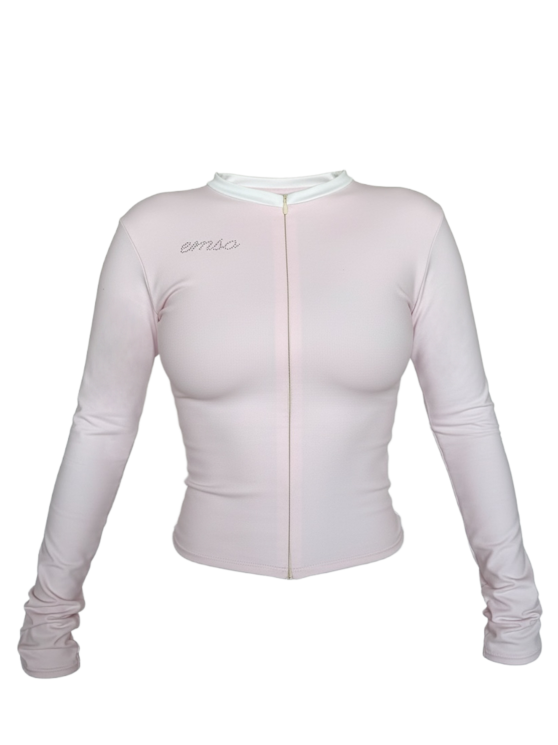 Soft baby pink long sleeve zip up top. White collar and invisible zipper. EMSO logo and signature zipper. Super thick, soft stretch fabric. Matching headband included when purchased as a set.