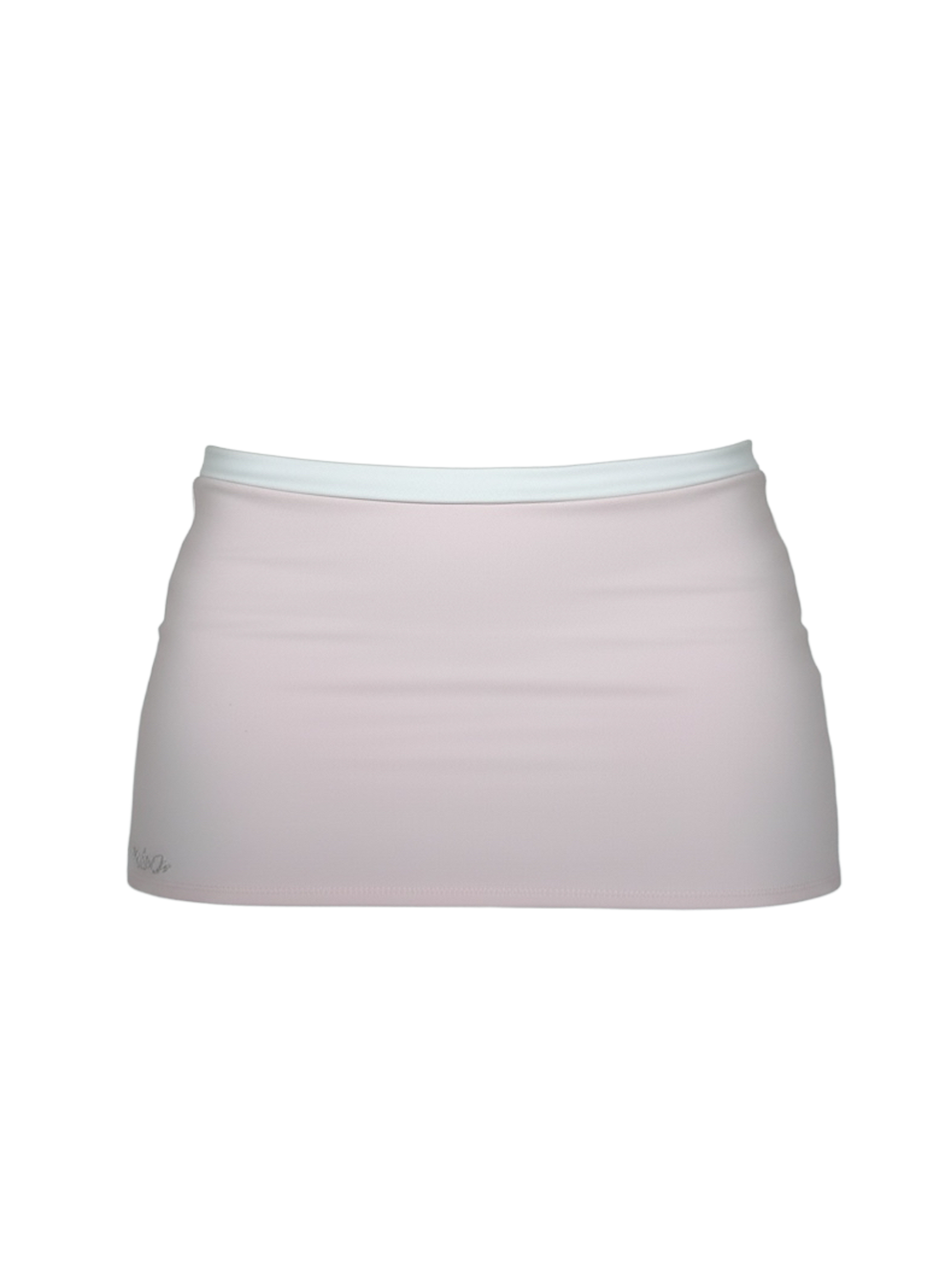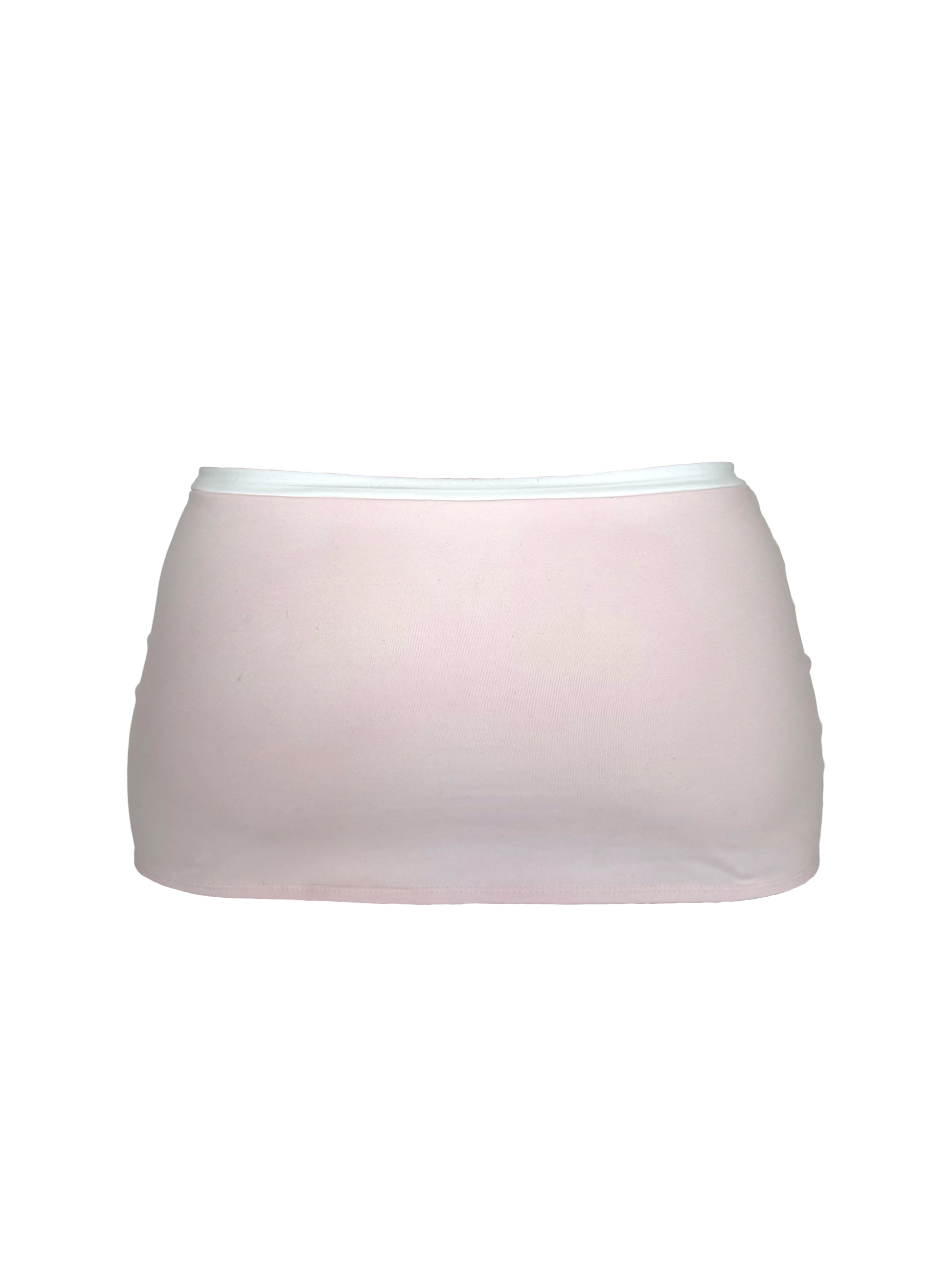 Soft baby pink low rise mini skirt with white band border. EMSO logo. Super thick, soft stretch fabric. Matching headband included when purchased as a set.