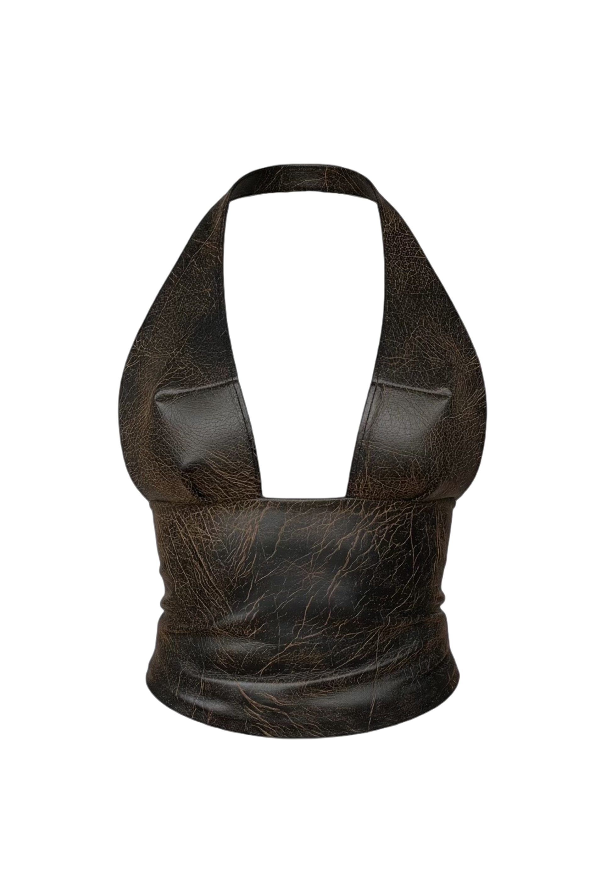 Vintage, distressed espresso colored faux leather halter top. Plunging bust with halter strap. Long-line top. Double lined interior. Zipper fastening at back. Non-stretch.