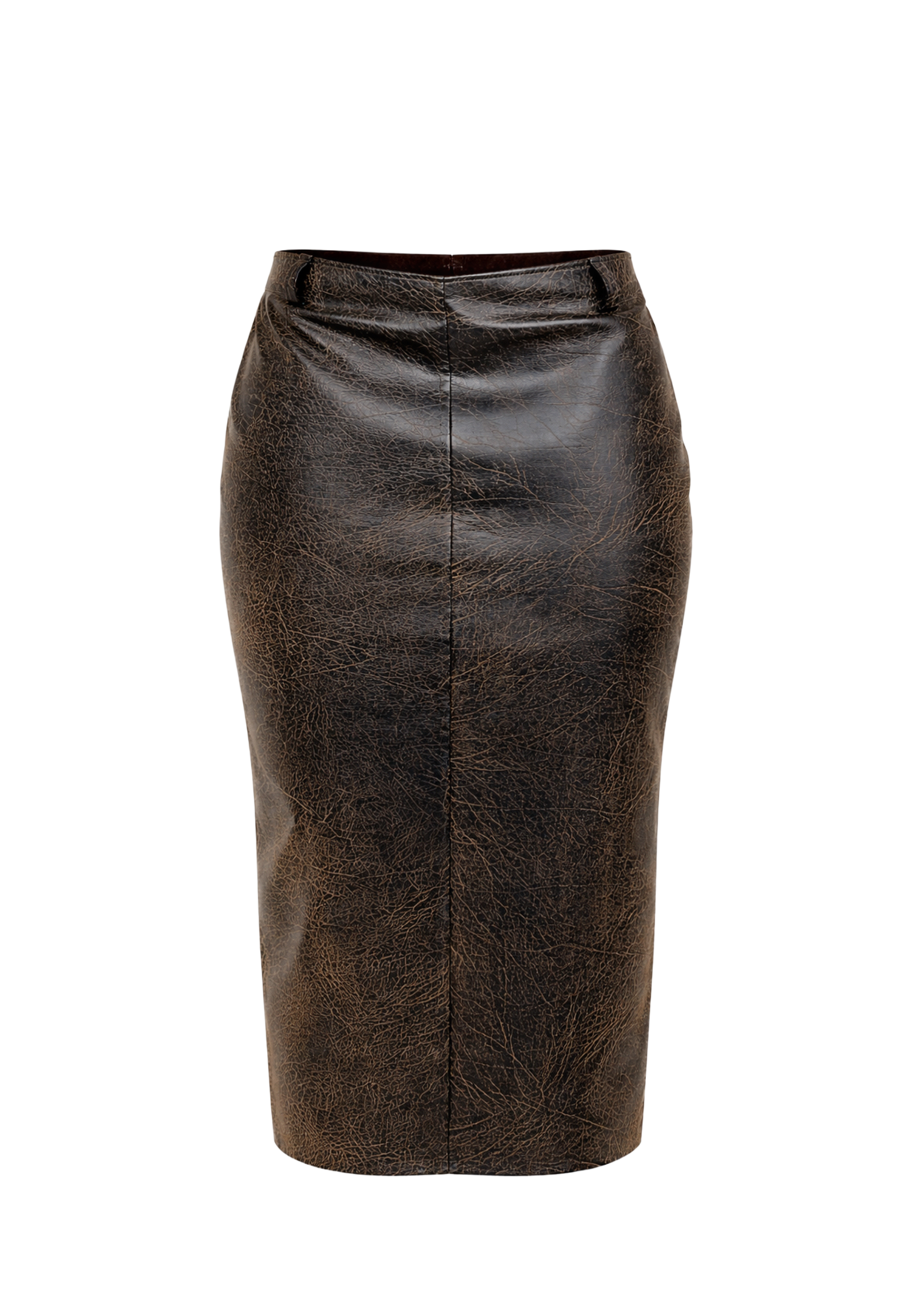 Vintage, distressed espresso colored faux leather midi skirt. Invisible waistband with belt loops. Midi fit that hits right below the knee. Zipper fastening at back. Low-waist design. Double lined interior. Non-stretch.