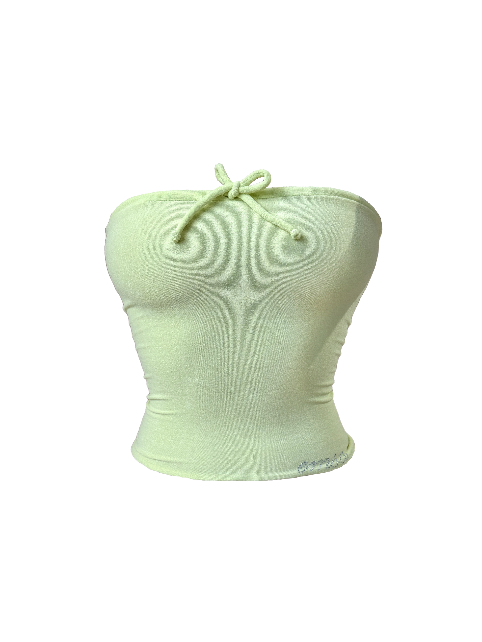 Lime green cropped terry tube top with drawstrings. Adjustable.  Hits middle to lower midriff. EMSO rhinestone logo. Stretchy