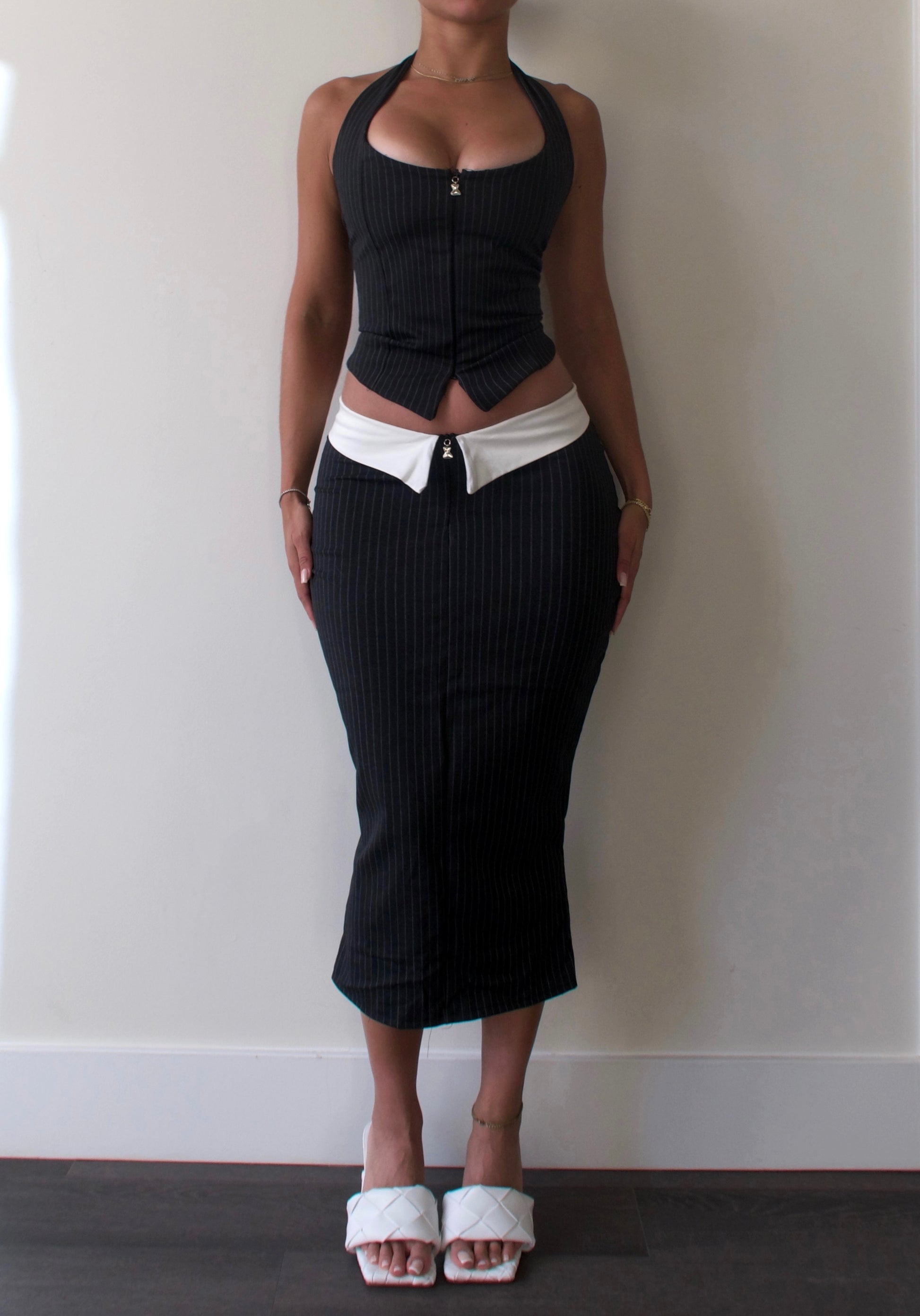 Pinstripe suiting-inspired midi skirt. White contrast collar detailing on waist. Front zipper. Back open leg slit. Has slight stretch.