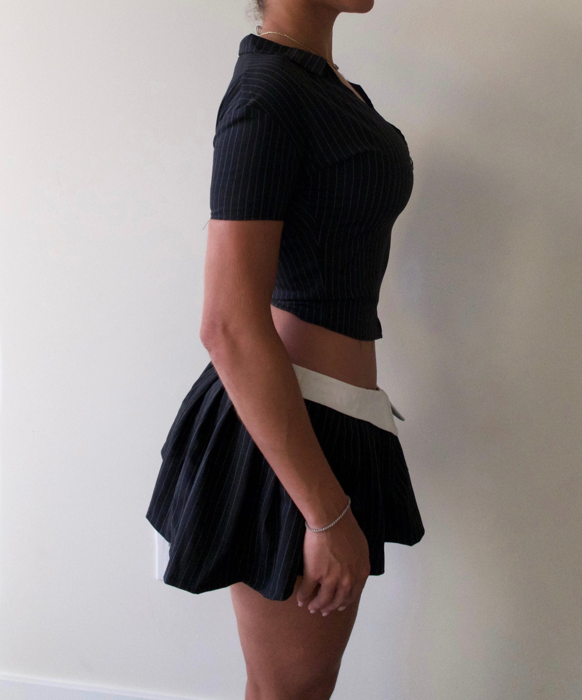 Pinstripe suiting inspired mini pleated skirt. Contrasting white collar at waist. Front zipper. Meant to sit on the low hip.