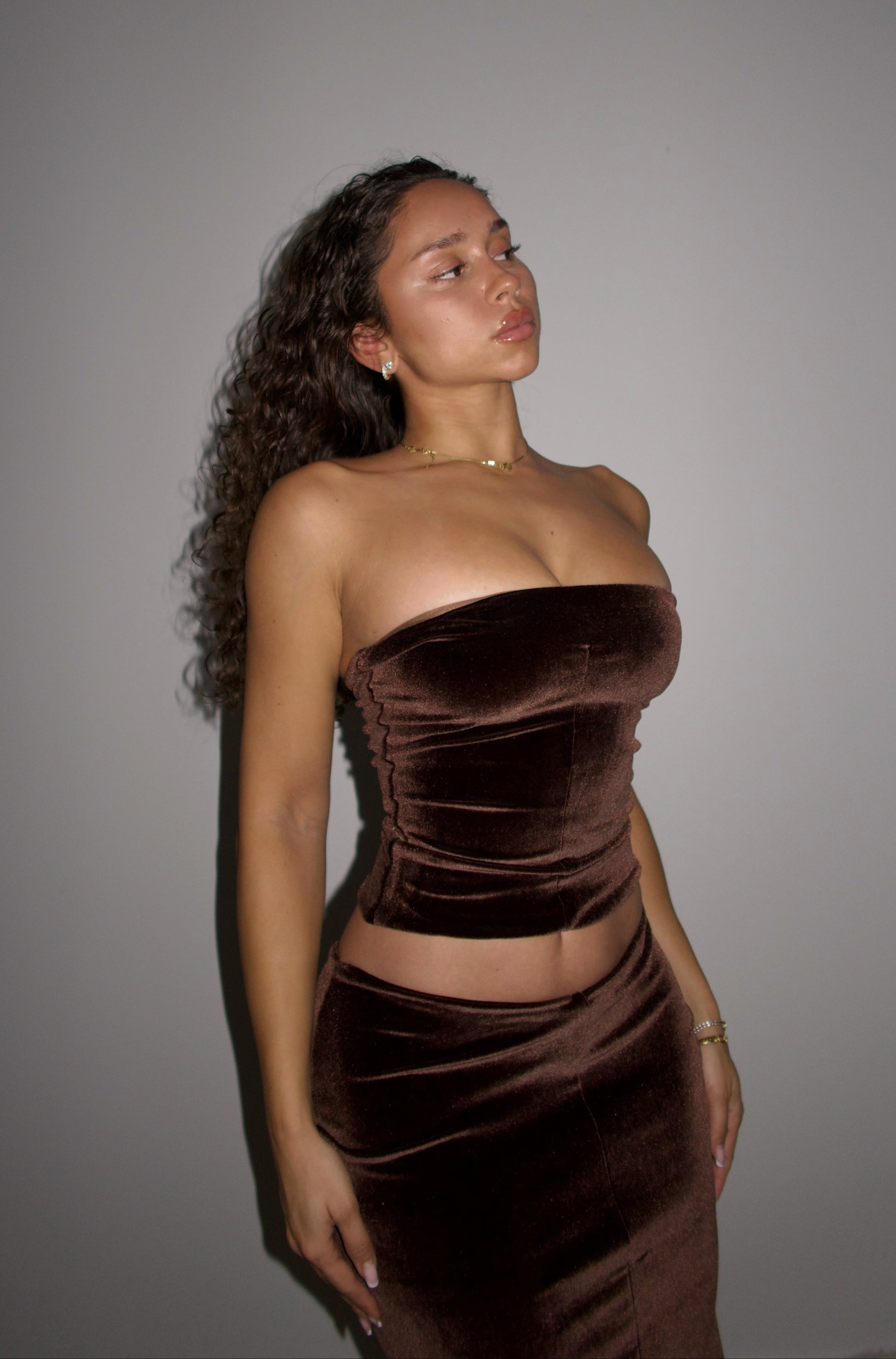Deep chocolate brown velour tube top. Corset-inspired with a center seam. Slightly cropped. Stretchy. Double lined. Pull on style.