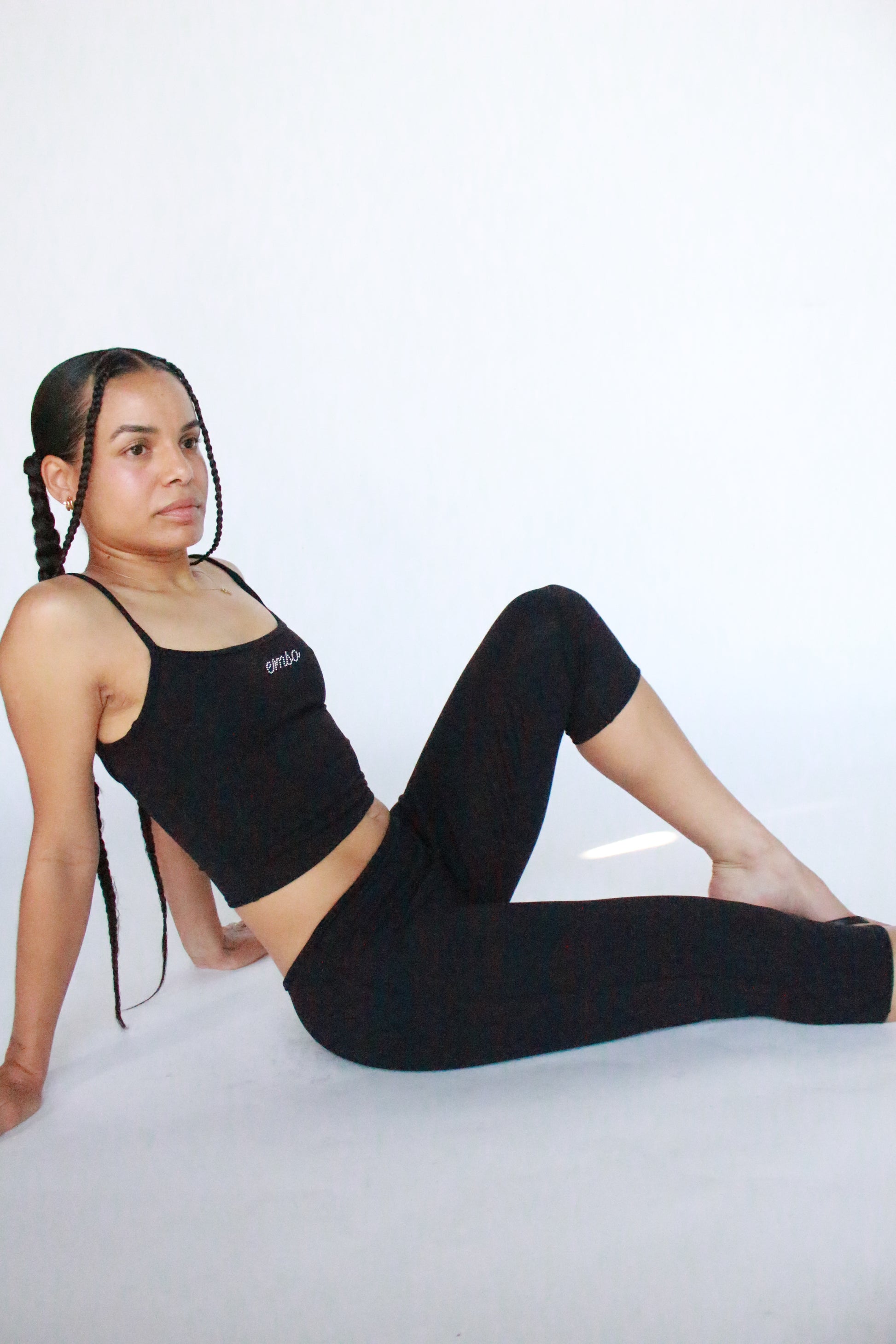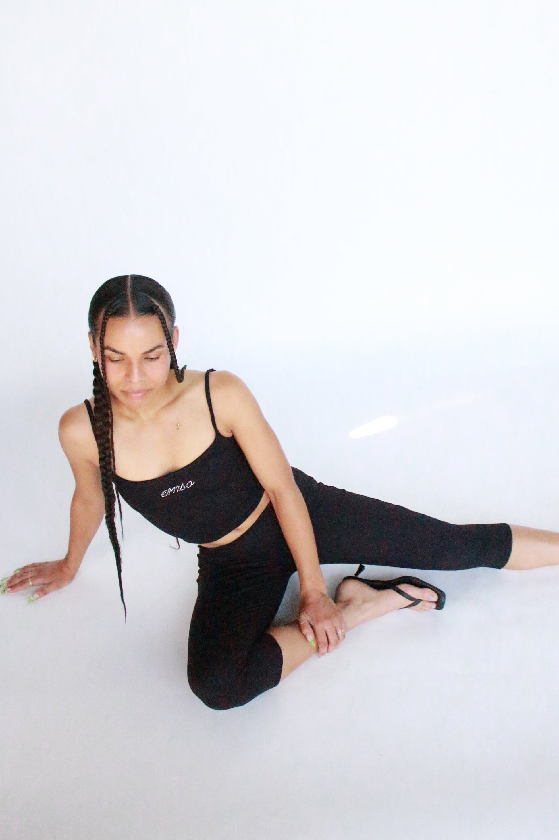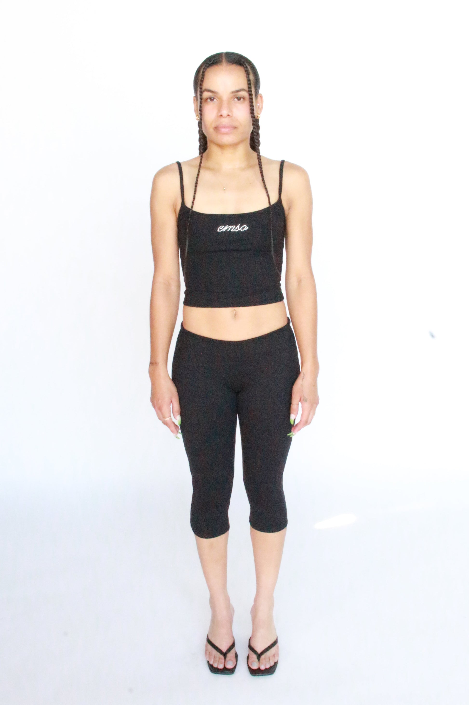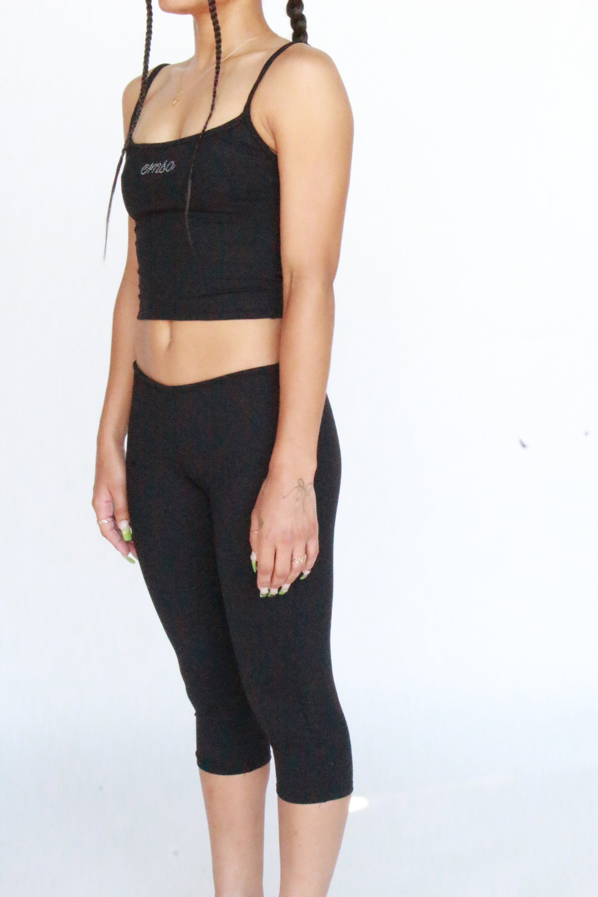 Black capri with black lining. Thick, stretchy, and contouring fabric that smooths your silhouette. Low-rise fit meant to sit on the lower hip. EMSO rhinestone logo on the back.
