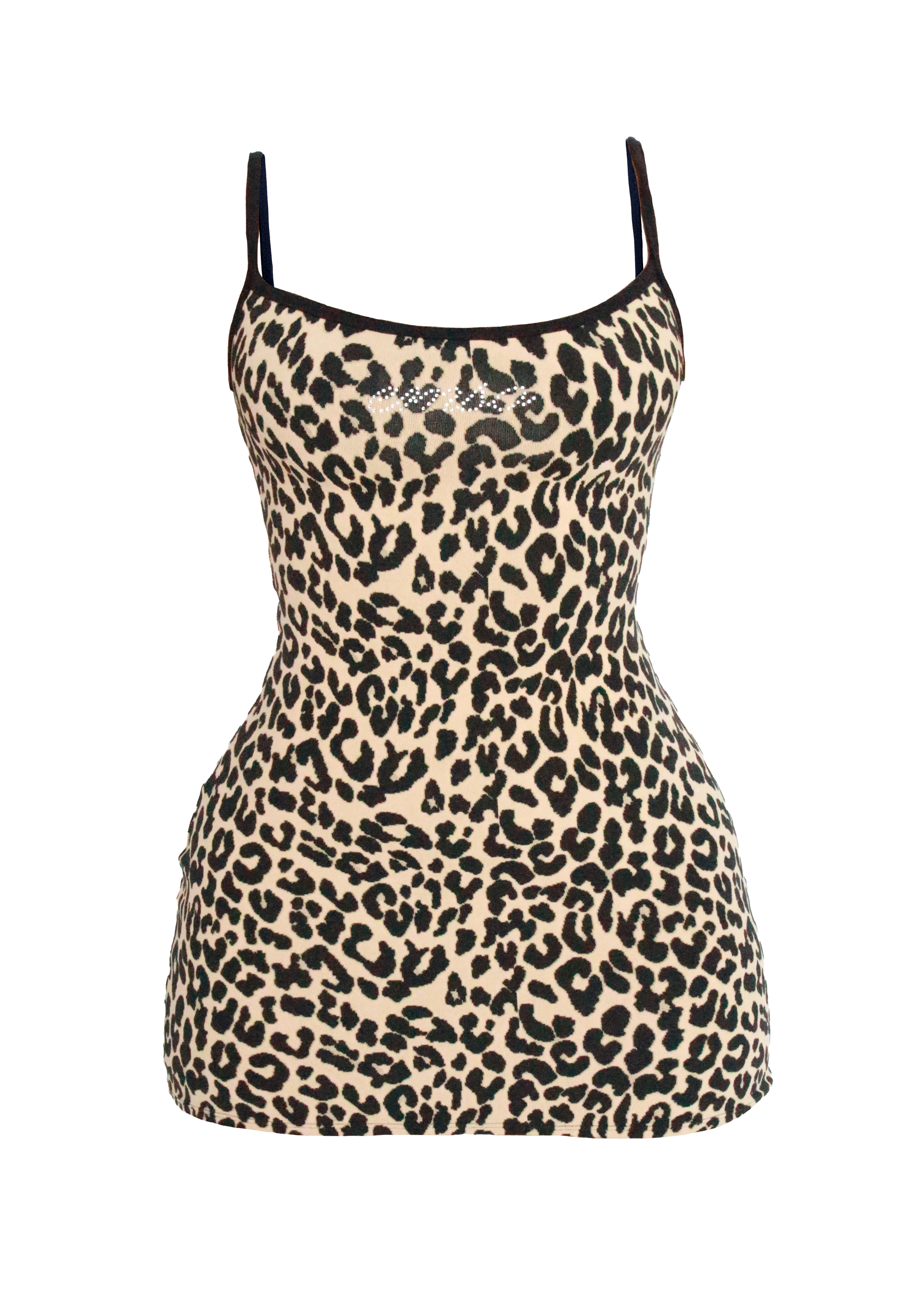 Leopard print mini dress with black lining. Thick, stretchy, and contouring fabric that smooths your silhouette. Lower back for a flattering finish. EMSO rhinestone logo.
